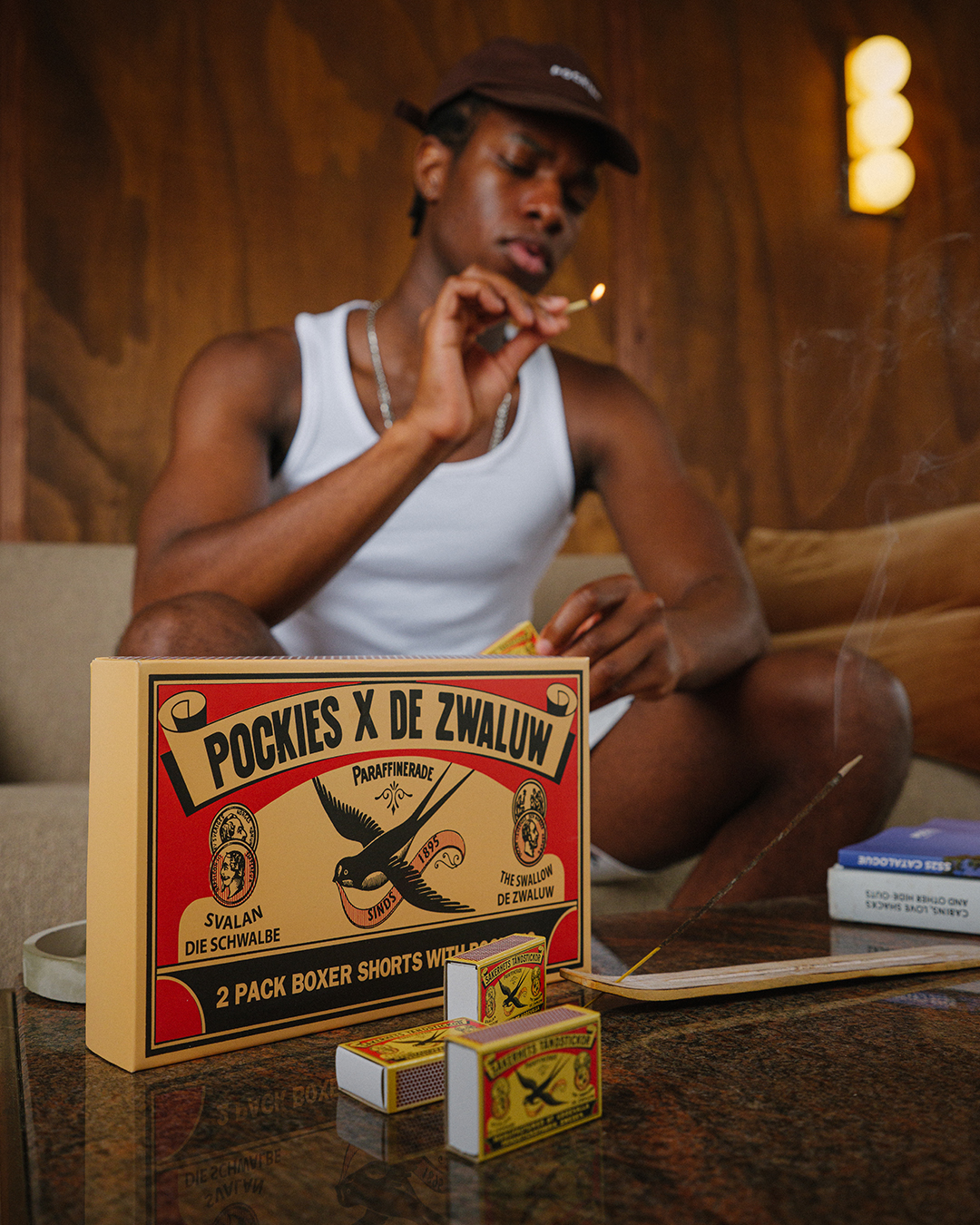 "We zijn helemaal blij om samen te werken met De Zwaluw, een merk dat een speciale plaats inneemt in Nederlandse huishoudens", aldus Michiel Dicker, medeoprichter van Pockies. "Dit luciferdoosje ligt in ieders keukenla, dus om het unieke design te gebruiken op onze kleding maakt zelfs mijn moeder blij. Bovendien: "Door de zakken hebben onze klanten altijd hun lucifers bij de hand, waar ze ook zijn."